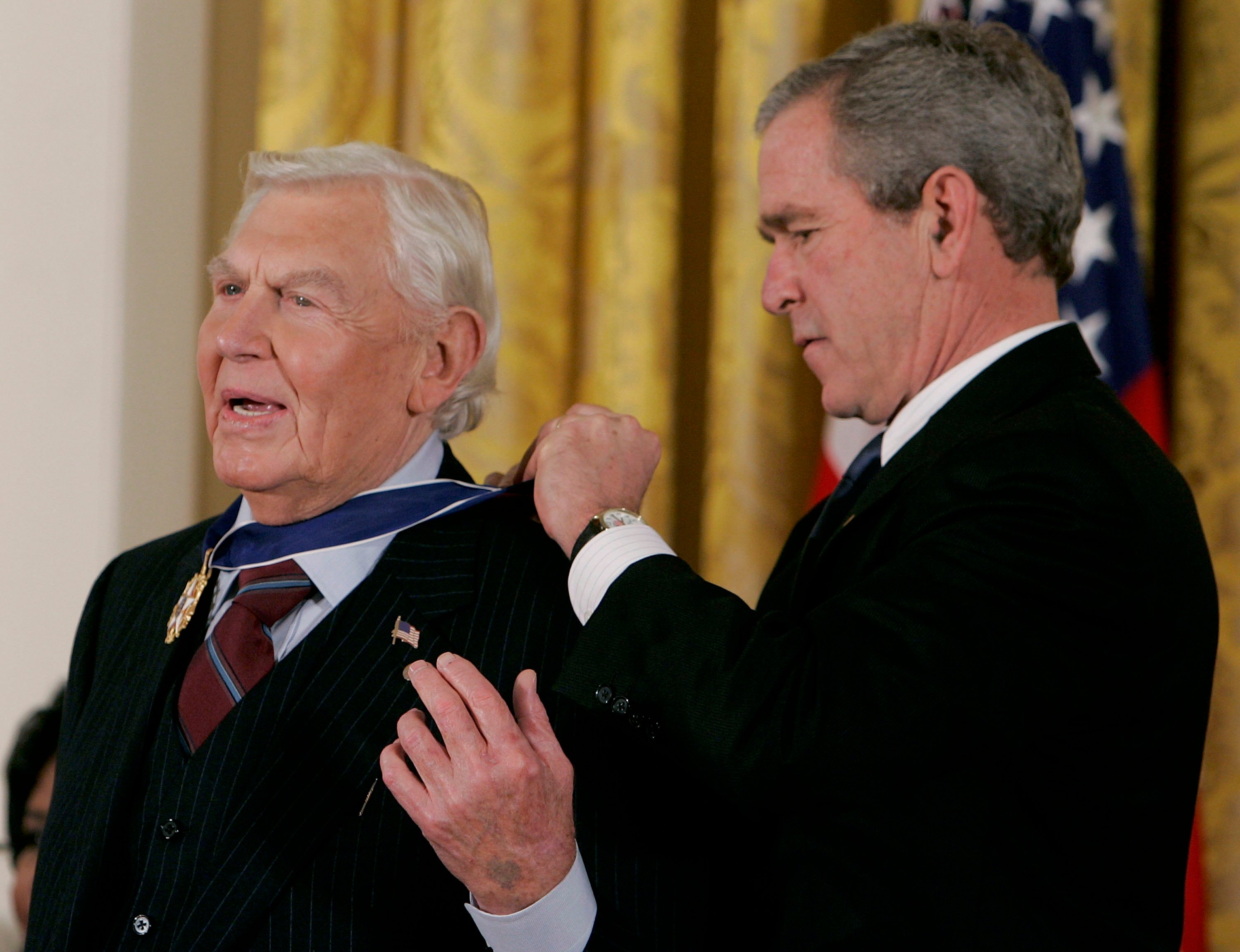 According to the White House’s website, Griffith received his Presidential Medal of Freedom from President George W. Bush in 2005. Other honorees at the ceremony included Aretha Franklin, Muhammad Ali, Jack Nicklaus, and Carol Burnett. The White House’s official statement about the event explained why Griffith received the award.